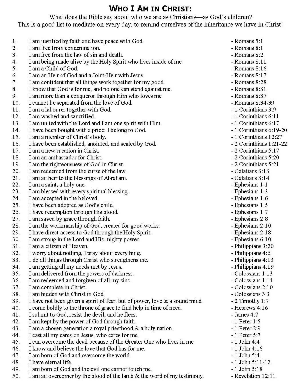 Resources “You will never rise above the level of your confession!” “Words Create Worlds!” DOWNLOAD YOUR FREE PRINTABLES BELOW ... Who I Am In ChristDownload Who I Am In Christ ListDownload Confessions About Me_Download Confession – Who I Am in GodDownload Confession – Walking in VictoryDownload Scriptures Against FearDownload PRAYING THROUGH THE NAMES OF GOD – Free Printable Prayer Cards EL ROI: The God Who Sees MeDownload EL SALI: God my RockDownload EL EMUNAH: The Faithful GodDownload EL CHAY: Living GodDownload ADONAI: Master Over AllDownload ABBA: FatherDownload ELOHIM: The Strong Creator GodDownload JEHOVAH JIREH: The Lord our ProviderDownload JEHOVAH ROHI: The Lord My ShepherdDownload JEHOVAH ROPHE: The Lord Our HealerDownload JEHOVAH SHALOM: The Lord Our PeaceDownload JEHOVAH EL-GEMUWAL: Lord of RecompenseDownload JEHOVAH SHAMMAR: The Lord is ThereDownload JEHOVAH TSIDKENU: The Lord Our RighteousnessDownload JEHOVAH: The Relational GodDownload Share this: Click to share on X (Opens in new window) X Click to share on Facebook (Opens in new window) Facebook Like Loading...